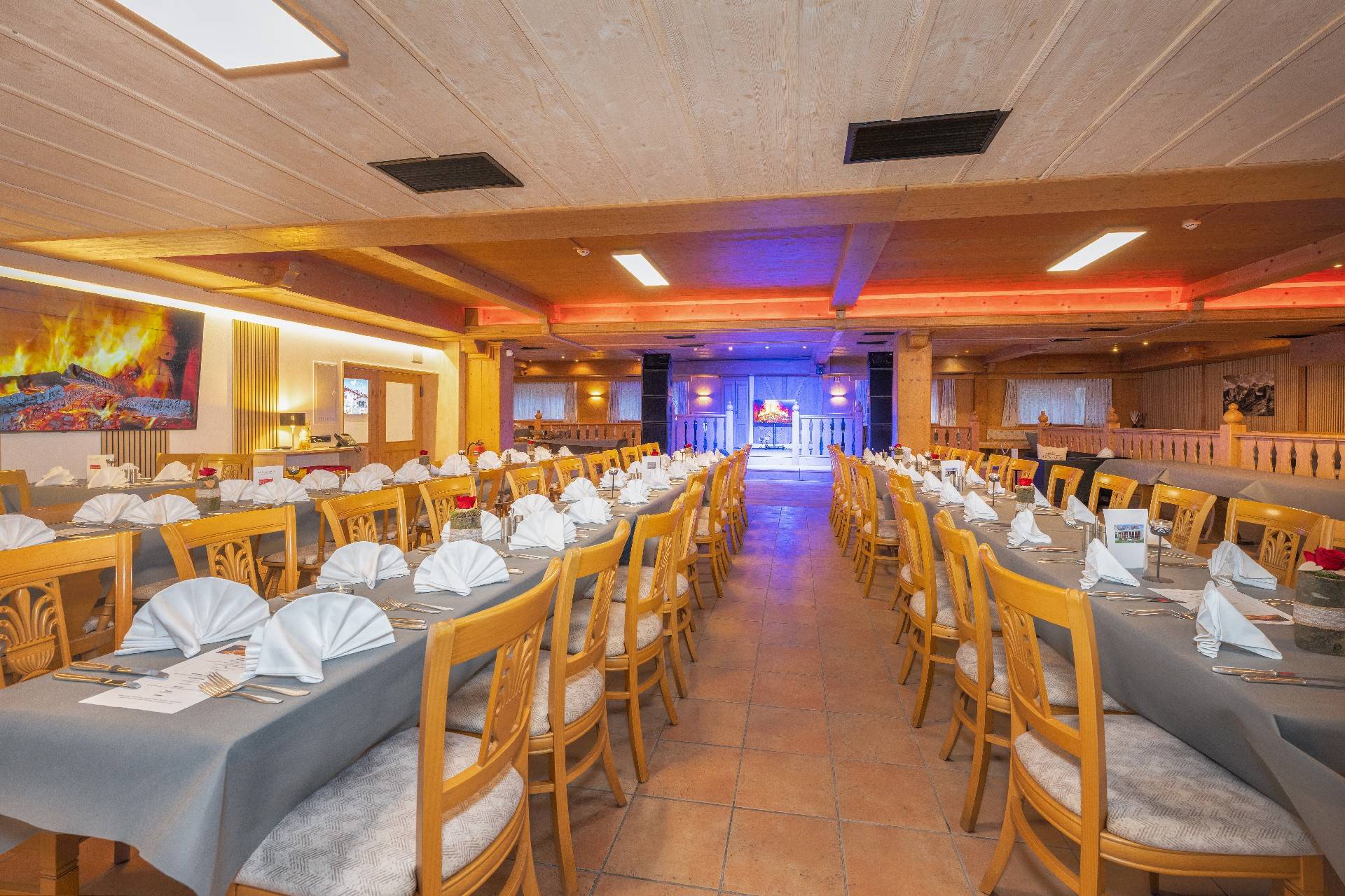 In unserem großen Saal mit Bühne und Bühnentechnik finden unsere Events und Großveranstaltungen statt. Auch TV-Sendungen wurden hier bereits aufgezeichnet. Die gemütliche, mit viel Holz gestaltete Ausstattung macht den Saal auch ideal für große Firmen- oder Hochzeitsfeiern. In den großen Saal gelangt man über die Außentreppe rechts vom Hotel.