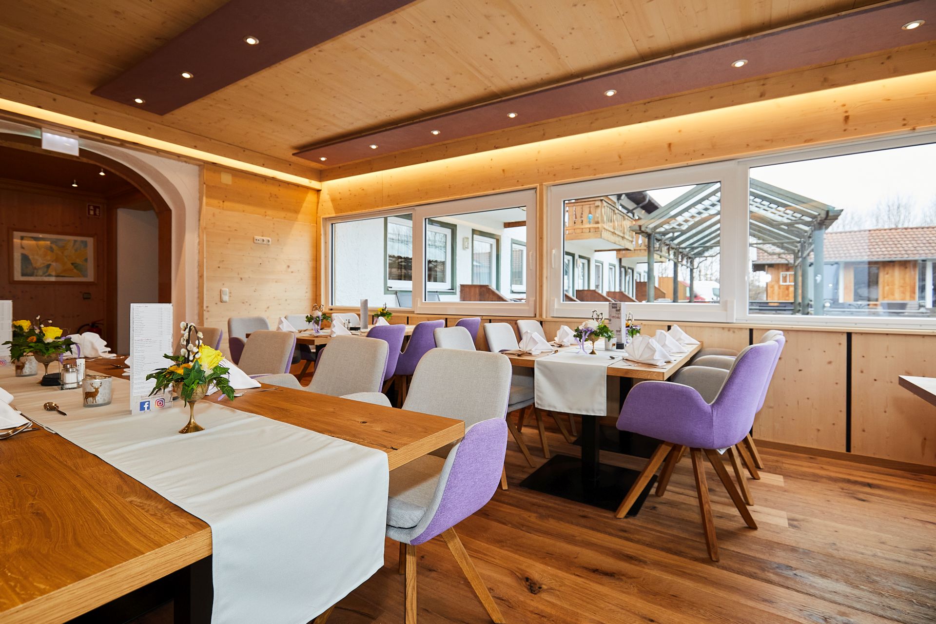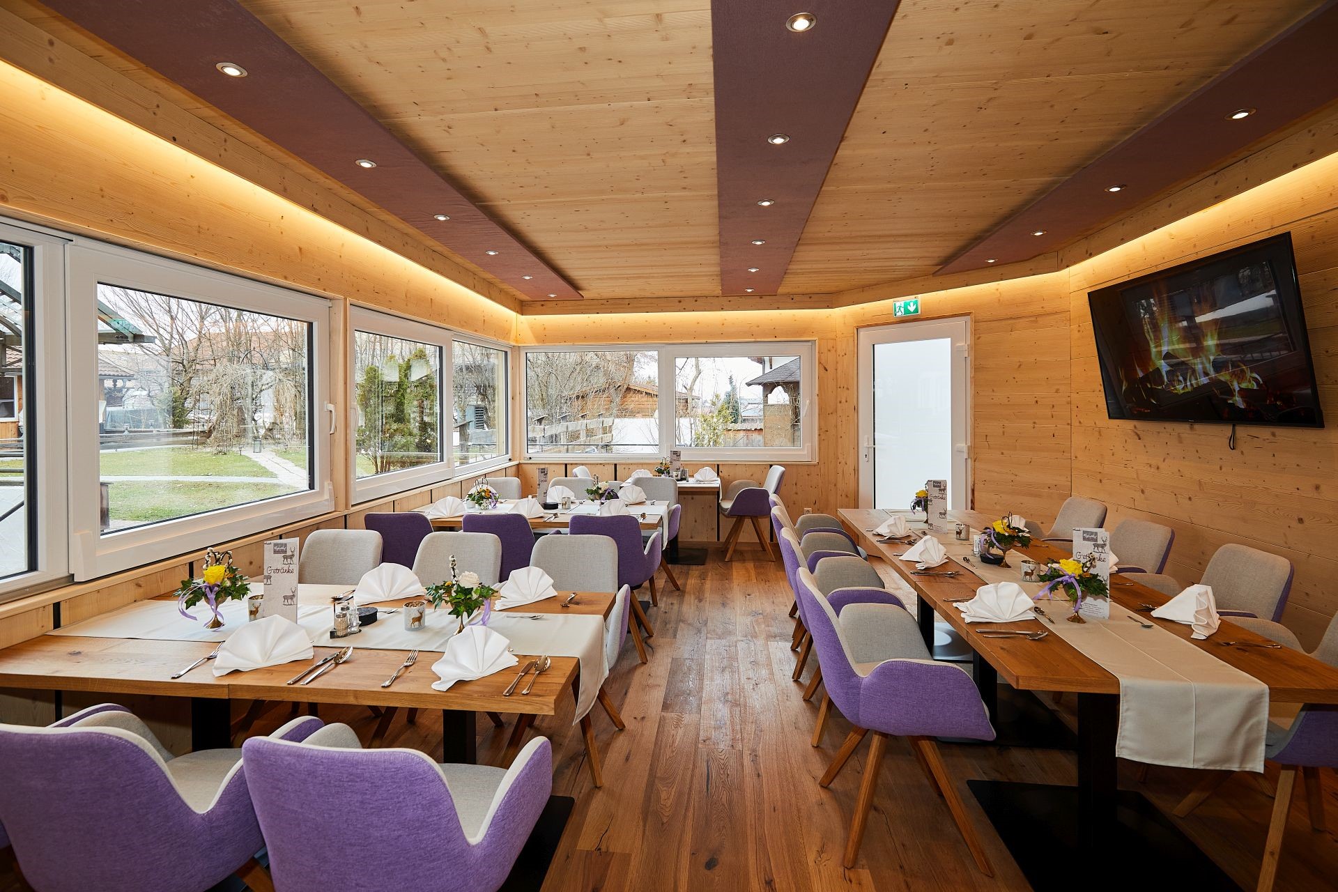 Das Wellnessstüberl ist einer der jüngsten und stimmungsvollsten Räume im Rupertihof. Als moderner Wintergarten gestaltet, verbindet es helle Glasflächen mit einer warmen, zeitgemäßen Einrichtung und schafft damit eine besondere Atmosphäre, die sowohl ruhig als auch offen wirkt. Durch das natürliche Licht und das freundliche Ambiente eignet sich der Raum ideal für Hotelgäste, die hier ihr Frühstück oder Abendessen in entspannter Umgebung genießen möchten.